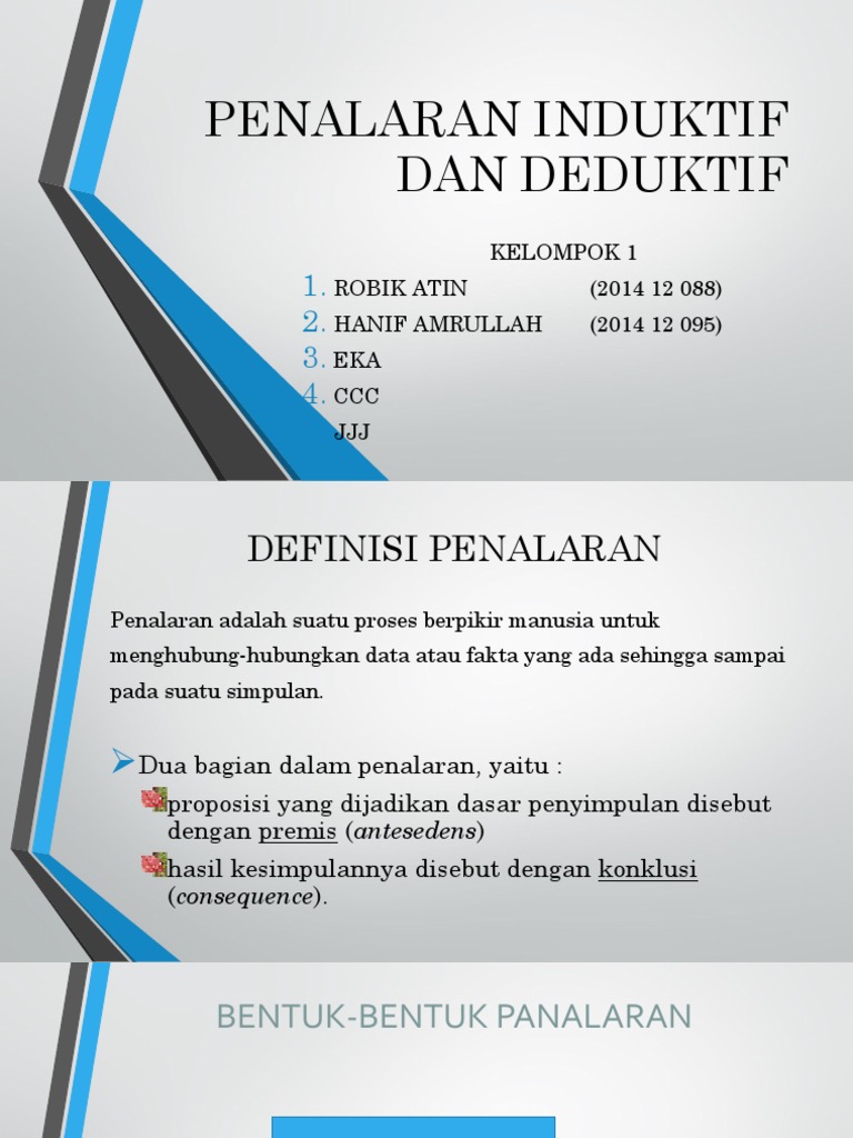 Sedangkan penalaran induktif adalah cara menarik kesimpulan yang bersifat umum dari menurut suriasumantri (dalam shofiah, 2007 :15) penalaran induktif adalah suatu proses berpikir yang. Perbedaan dasar di antara keduanya dapat. Makalah filsapat ilmu penalaran, logika, deduktif, induktif dan metode ilmiah pendahuluan filsafat adalah suatu cara berpikir yang radial dan menyeluruh. Pengertian dan penjelasan penalaran induktif. Penalaran induktif penalaran induktif merupakan pr#sedur yang berpangkal dari peristi%a khusus sebagai hasil pengamatan empirik aspek dari penalaran induktif adalah anal#gi dan generalisasi. Penalaran induktif merupakan prosedur yang berpangkal dari peristiwa khusus sebagai hasil pengamatan empirik dan berakhir pada suatu kesimpulan atau pengetahuan baru yang bersifat umum. Generalisasi generalisasi adalah proses penalaran yang bertolak dari fenomena individual menuju kesimpulan umum. Tes penalaran induktif mengukur kemampuan yang penting untuk menyelesaikan masalah. Generalisasi adalah bentuk dari metode berfikir induktif. Argumen dalam penalaran induktif bisa kuat atau lemah. Penalaran terbagi menjadi 2 jenis, yaitu penalaran induktif dan penalaran deduktif. Penalaran induktif adalah tipe penalaran yang berawal dari sekumpulan contoh fakta spesifik menuju kesimpulan umum. Penalaran dibagi menjadi dua, yaitu penalaran deduktif dan penalaran induktif.
